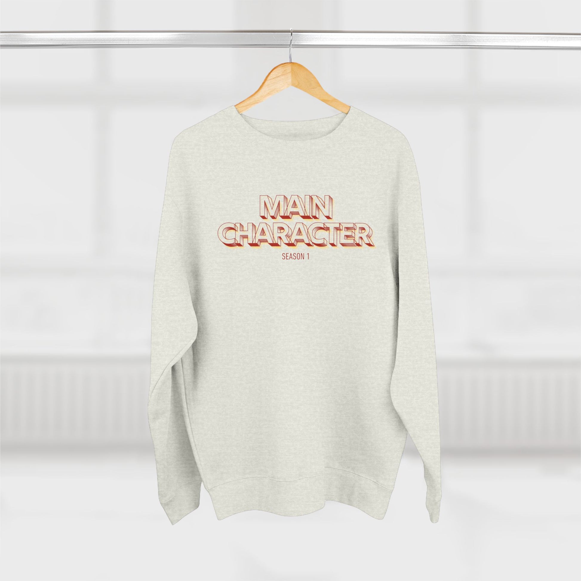 A cozy, midweight crewneck that reads loud and playful. The bold "MAIN CHARACTER" graphic sits across the chest in warm, glowing tones — a little theatrical, a little nostalgic — so you step into a room like you belong in the scene. The sweatshirt drapes in a relaxed, regular fit with durable side seams and a ribbed knit collar that keeps its shape. Inside, soft 3-end fleece and a taped neck seam make it feel lived-in from the first wear. Reach for this on cool mornings, late-night hangs, or when you want your look to say confident without saying a word.